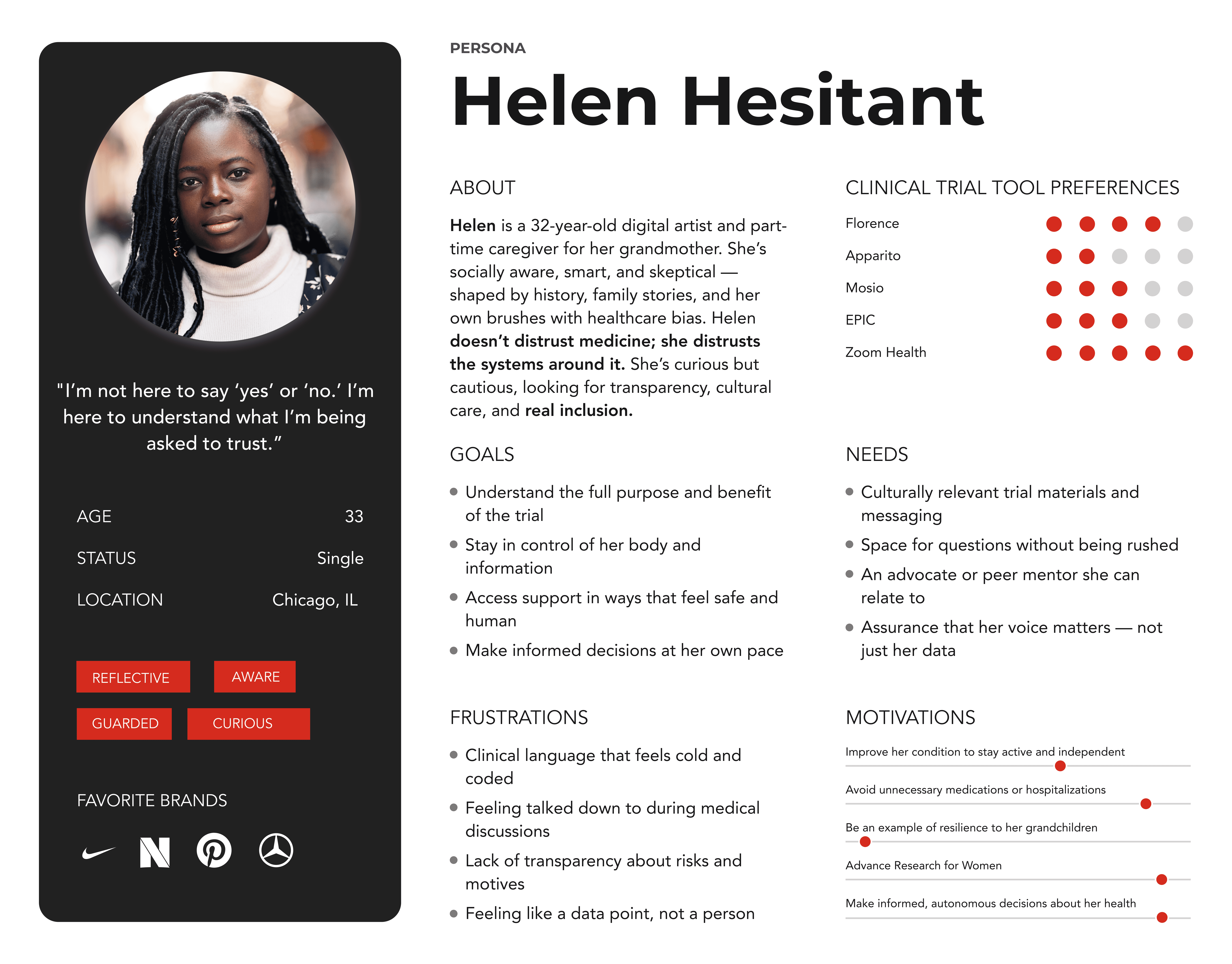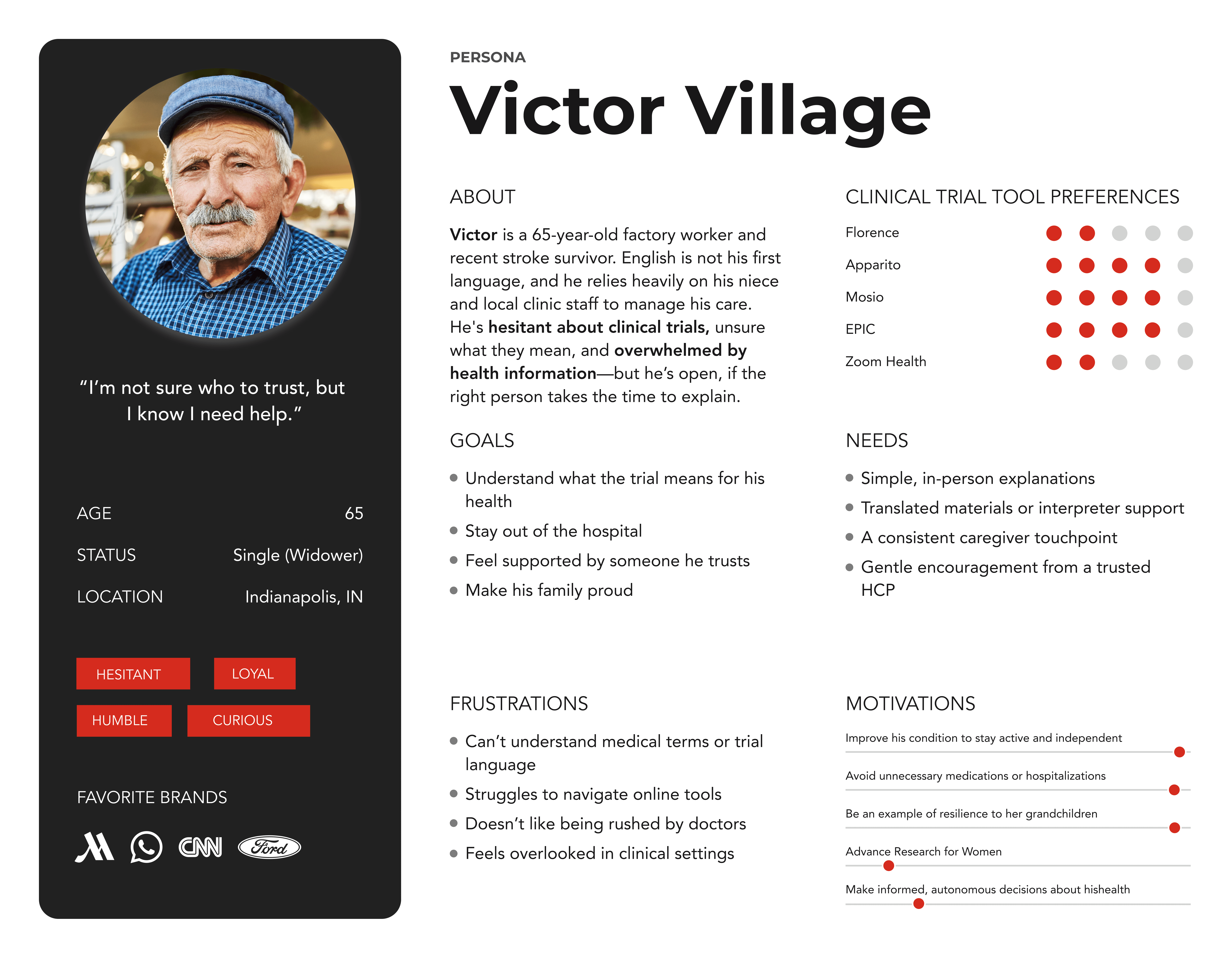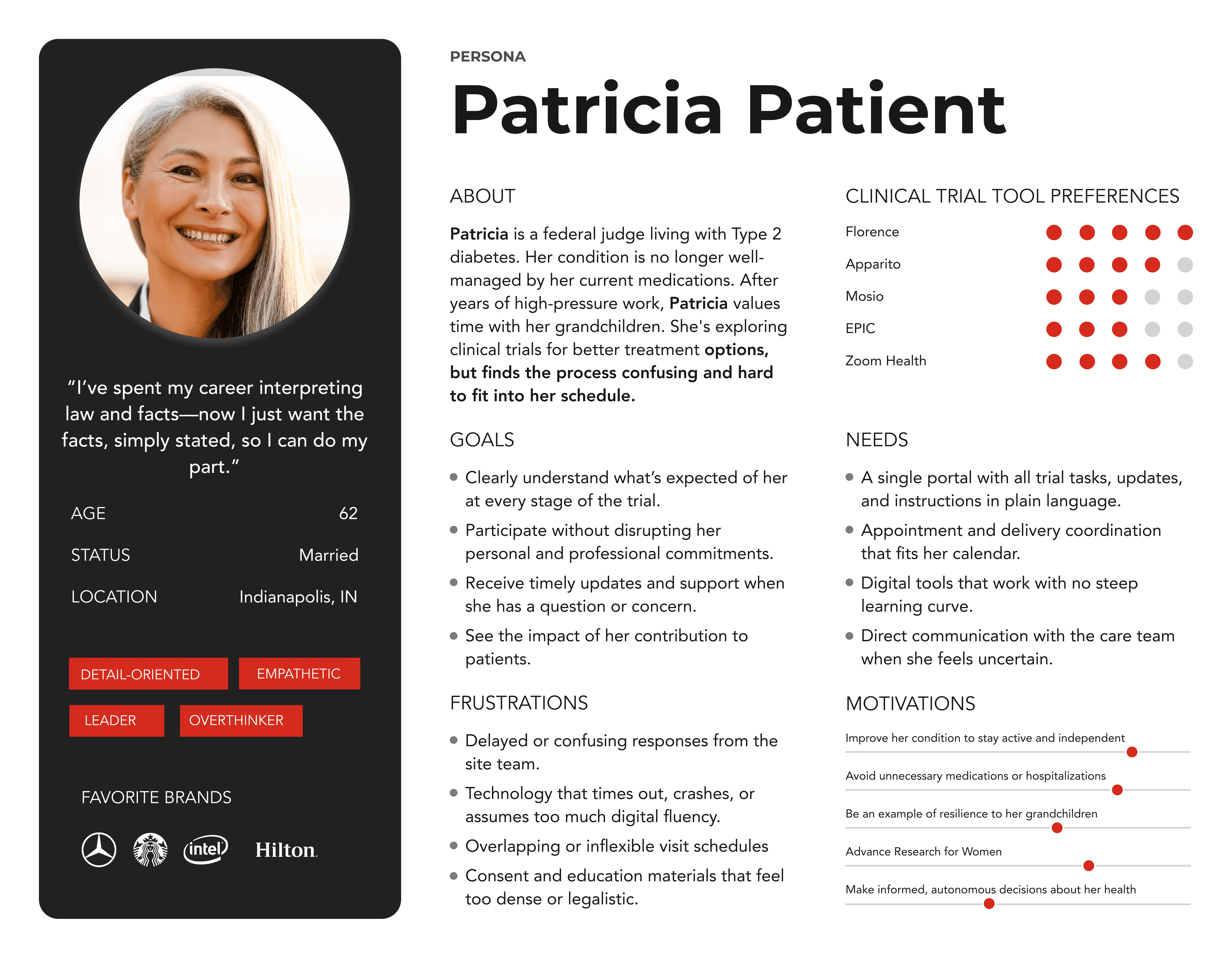 Based on multiple cross-functional Design Thinking workshops and user feedback, we distilled Trials.Lilly.com Web 3.0 audiences into three primary mindsets. All of them are navigating high-uncertainty, high-emotion health decisions, but they differ in comprehension needs, trust thresholds, and preferred support. These personas directly informed our 3.0 information architecture, template strategy, and Design System requirements.